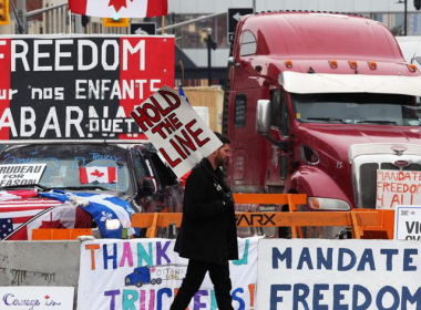 Des militants canadiens anti pass sanitaire et pass vaccinal bloquent la capitale canadienne d’Ottawa, en bloquant les routes avec des véhicules et en militant avec des banderoles (crédit photo : AFP)