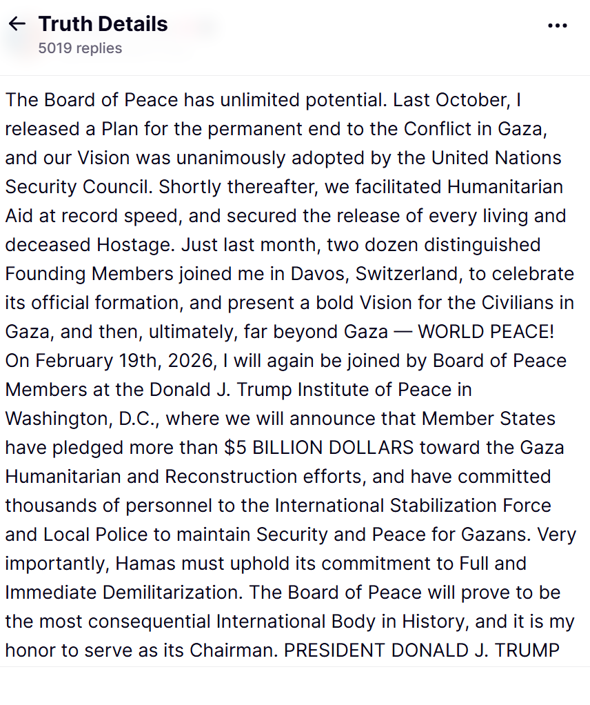 Le dernier otage israélien a été rendu fin janvier 2026, mais la crise humanitaire a continué, nécessitant une réaction diplomatique rapide. C’est dans ce contexte que s’est déroulée la première réunion officielle à Washington, au sein de l’Institut Donald J. Trump pour la paix (ex-Institut des États-Unis pour la paix), comme l’a annoncé le président américain sur son réseau Truth Social. L’objectif était de « promouvoir la stabilité, de rétablir une gouvernance fiable et légitime et de garantir une paix durable dans les régions touchées ou menacées par des conflits », à travers cette « organisation internationale » (art. 1, chap. 1).